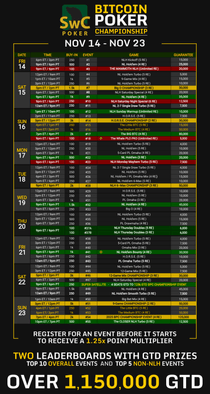The 2025 Bitcoin Poker Championship runs from November 14th to November 23rd and features events with buy-ins ranging from 100 μBTC up to the 5,000 μBTC 9-Game Championship!