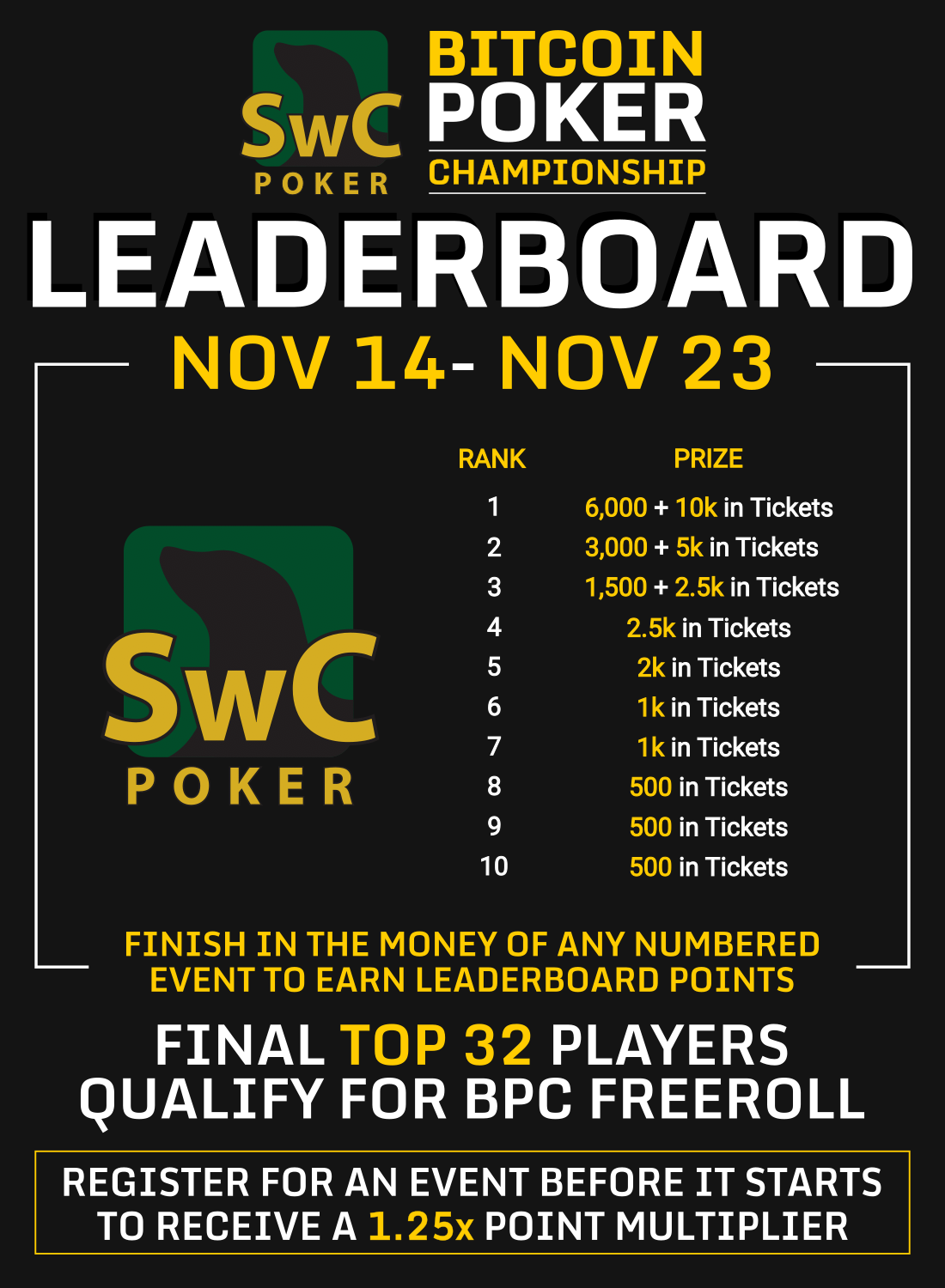 Finish in the money of any numbered event to earn leaderboard points. Players that register for an event before it begins will also receive a 1.25x leaderboard point bonus!
