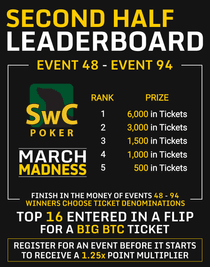 If you’re a clutch player that finishes strong you will enjoy the Second Half Leaderboard comprised of points earned from Event #48 to Event #94. The Top 16 players on the Second Half Leaderboard will be entered in a FLIP satellite to win a BIG BTC ticket!