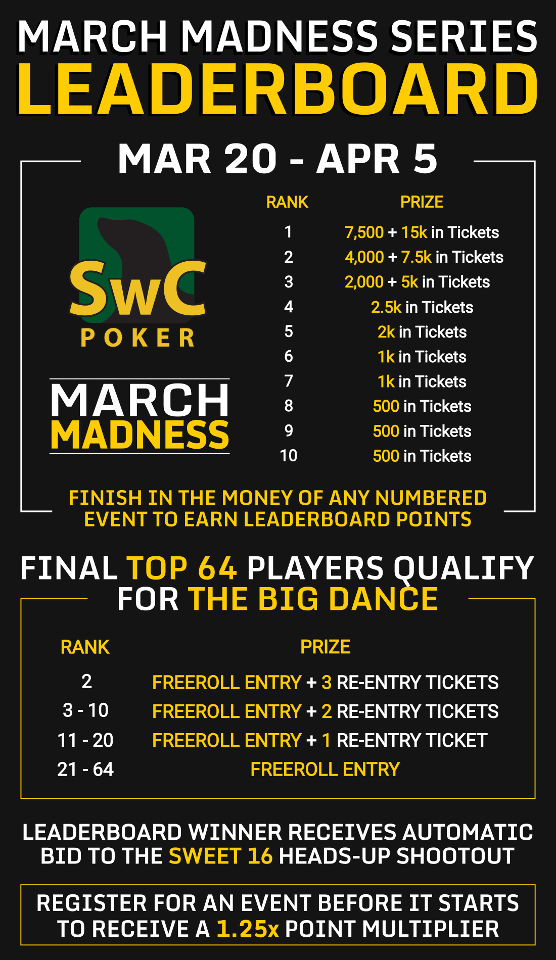 The final Top 10 players on the Overall Leaderboard will win guaranteed prizes. The final Top 64 players will also qualify for The Big Dance Freeroll!