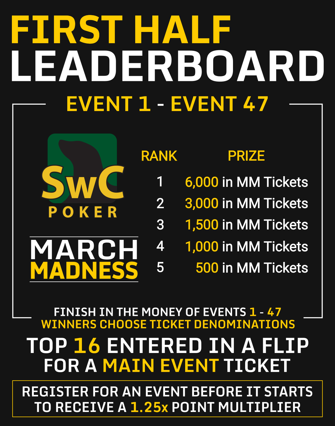 The First Half Leaderboard will award prizes to the Top 5 players that earn points from Event #1 to Event #47. The Top 16 players on the First Half Leaderboard will also be entered in a FLIP satellite to win a March Madness Main Event ticket!