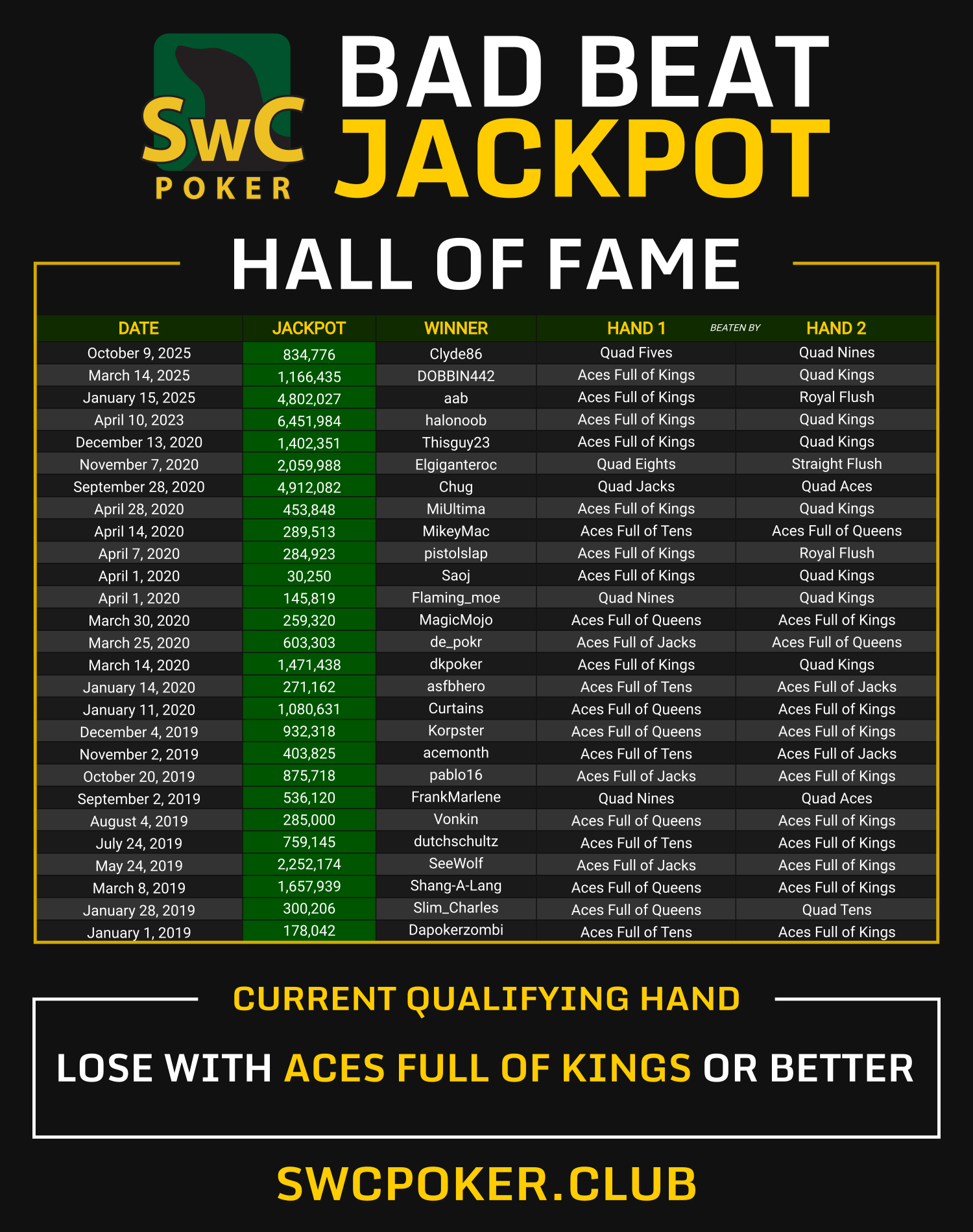 SwC Poker is proud to announce our Bad Beat Jackpot. Win big when you lose with Aces full of Kings or better in a qualifying situation: